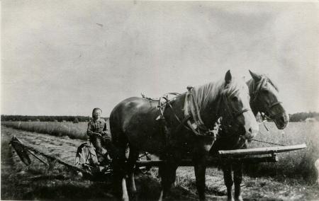 Från vänster syns hästarna Pion och Putte. Hästarna är spända för McCormick slåttermaskinen med stålbom. Hästarna är tillsynes nöjda över vilopausen samt körsvännen över den goda gräsväxten.