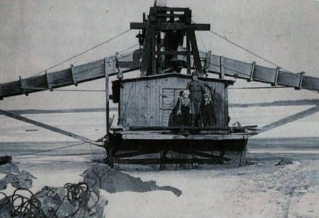 Foto från 1954 av mudderverket som användes vid det nya utloppet av Toby å på 1940 och 1950-talen.
