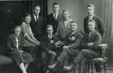 Det var sed på1930-talet i byn att man ordnade en fest för att ta avsked av sina vänner som stod i beråd att emigrera, i det här fallet till Australien. På detta ateljefoto ser vi från vänster Vivi Forth, Ellen Forth gift Svarvar, Uno Nedermo, Valfrid Vesterlund, Signe Dahl gift Svarvar, Runar Backman och Teodor Enegren. Sittande i mitten av fotot med en blomma i kavajen de båda som emigrerade, Oskar Uppgård och Axel Kivelä. Oskar hade en bror i Australien sen tidigare, Axel född 1906 var fosterson hos Israel och Karolina Staaf. Flitiga ynglingar som torde ha klarat sej gott i sitt nya hemland.
