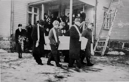 Begravningen den 10 november blev en sorgedag icke allenast för hans anhöriga utan också för hans vänner, grannar och bybor som samlats till en minnesstund vid Tölby-Vikby skola. Bilden visar då han bärs av fr.v. brodern Verner svartklädd, Anselm Näs i uniform brodern Gunnar i uniform, Brodern Andrew i uniform skymd av Einar Rosendahl samt Teodor Enegren i uniform med mantel. Närmast kistan Unos syster Helmi Glasberg. Längre till vänster Sigrid Rosendahl med krans.