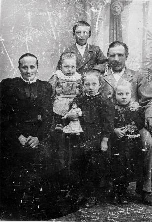 Fotografi av paret Ehn, senare Ehnholm. Kristian Gabriel Andersson Ehn, senare Ehnholm som familjenamn, föddes år 1853 på Ehn no 2 Tölby. Gift andra gången med Vendla Gustavsdotter Påfs, född år 1862. Paret var först bönder i Tölby och senare gårdsägare i Vasa. Överst på bilden sonen Samuel samt Gunnar, sedermera professor, dottern Ester emigrerade till Amerika och längst ner till höger dottern Elsa, gift Roos.