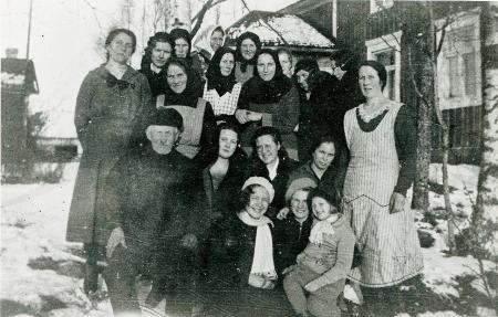 Stående från vänster: Ellen Enegren. Milja Österberg, gift Snickars. Maria Påfs. Edit Thölix. Amanda Påfs. Alma Snickars, gift Påfs (skymd).