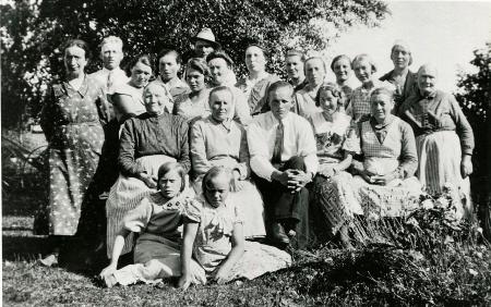 Fotografi av bröllopsgäster dagen efter Hugo och Siris bröllop den 10 augusti 1935.