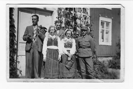 Från vänster, Runar Backman, Estrid Rodas, Emil Rodas, de övriga ej kända. Bondgård.