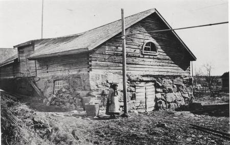 Ida Enegren född Lervik 1871 i Sundom, husmor på Enegren från 1893, framför gårdens fähus i sten.