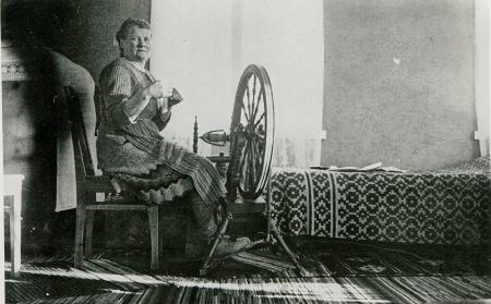 Irene Enegren vid sin spinnrock