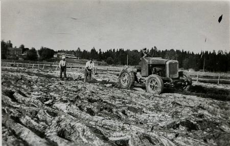 Biltraktorn anskaffad av Emil Rodas i slutet av 1940-talet. Emil Rodas, född 1912, själv vid ratten. Erik Rodas, född 1922, styr plogen. Edvin Uppgård, född 1899, följer med plöjningen på sin hemåker nedanför hemgården. En del av hans uthusbyggnader, smedjan och rian synliga i bakgrunden på bilden.