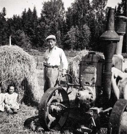 Sven Back, måg hos Wörtsgården, med sin traktor och två av sina tre döttrar, Gunilla och en skymd Birgitta.