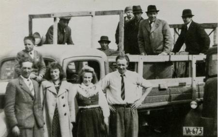 Fotografi av en grupp av Tölbybor som är på resa för att besöka en lantbruksutsällning i Purmo år 1949.