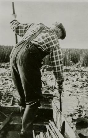 Einar Rosendahl, född 1897, "sätter ut" braxenryssjor. Fisket och fräkenbärgningen i Fladan som foder åt de egna djuren var den inkomst som den obesuttna befolkningen intill slutet av 1940-talet i huvudsak levde på.