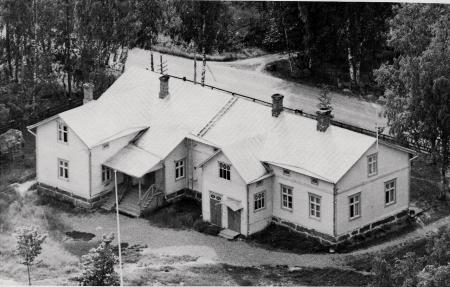 Tölby-Vikby folkskola efter tillbyggnad 1928 med lärarinnebostad och ett nytt klassrum med ingångstrappa till vänster i bild.