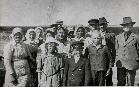 Passagerare som återvänt från stadsresa med Karl Dahls "Skäri-Kal" motorbåt. I bakgrunden Stadsfjärden och Vasa. Från vänster: Ulla Fort (Haga Ulla), Alina Rodas (Johannesas-Lina), Jenny Fort (från Gerby), Maria Norrgran (Erkas Maj), Karl Dahl (Skäri Kal), Einar Rosendahl (Haga Einar), Sofia Rodas (Gambä Jannes Fia), Brita Fred (Torparis Brit), Alma Fort (Haga Alma), Robert Fort (Dåll Agustas Robert), Evert Påfs (Uldrikas Evert), och Axel Kivelä (Iselas Axel). De tre barnen i främsta ledet: Irma Mäkynen (Skomakaris Irma), Rafael Forth (Hanlaris Rafael) och Arne Smeds (Haga Arne).