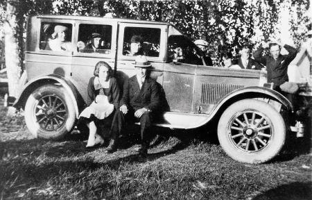Bak i bilen: Elsa Svarfvar, gift Rönnqvist i Kvevlax. Resten okända.