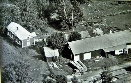 Flygfoto från omkring 1960. Uthuslängan med fähus och hölada och nödvändiga förrådshus var då nybyggt.