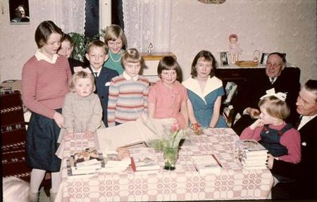 Från vänster Margaretha Thölix, Stig-Ola Thölix, Gerd Paxal, Kasten Österholm, Ulla-Maj Forth, Elsbeth Forth, Mary Smeds, Gunnevi Backman, församlingens kantor Lundén. Marianne Thölix sitter i pappa John Thölix famn .