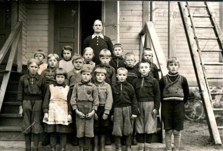 Överst lärarinnan Lisa Nygård. översta raden: Inga Påfs, Margit Österberg, Rakel Laaksoharju, Rolf Enegren. Mellanraden: Per-Erik Granholm, Börje Påfs, Holger Skoglund, Hilding Hagman, Elis (Eskil) Engberg. Nedre raden: Albin Johansson, Gunhild Gök, Harald Johansson, Alf Granholm, Herbert o Ragnar Renfors och Helge Back.