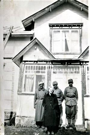 Fotot taget vid "Rövas" utanför kvisten. På bild Margit Påfs och de soldatklädda till vänster Bengt Österholm, de övriga okända.