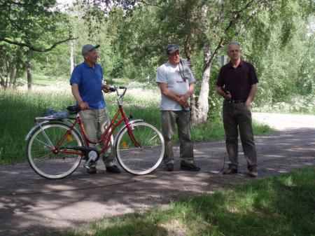 Jarl Martin med cykel, Folke Smeds och Kjell-Erik Backman diskuterar dagens program och fortsatta inspelningar.