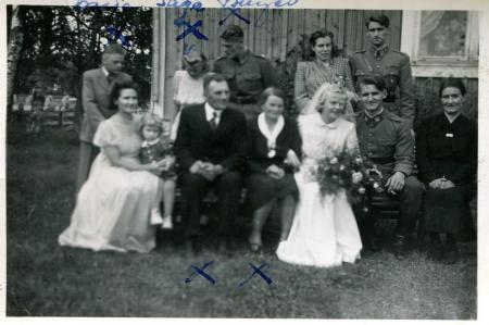 Brudparet Margit f Påfs och Bengt Berg. Sittande Bengts syster Karin med dottern Britta i famnen, Margits föräldrar Johannes och Ester Påfs, och längst till höger Bengts mor Sigrid. Stående Margits syskon Börje, Saga och Birger samt Bengts bror Kalle och hustrun Etel. fotot taget vi brudens hem i Tölby.