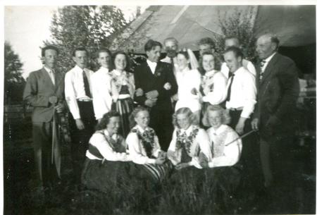 Brudpater Eric och Ragnhild f. Lervik i Söderfjärden i mitten. Övriga fr. v. Pehrström, Karl-Erik Majors, Kurt Berg, Elli och Arne Sjöberg, sittande okänd, Elma Kvist, Signhild Sjöberg, Inga-Britt Kull.