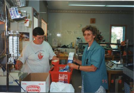 Till vänster, butiksinnehavaren Rut Norrgran betjänar kunden Doris Johansson.