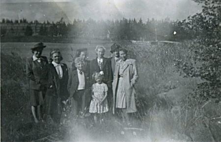 Fotografi, troligen från resan till Petsmo i slutet av 1940-talet. Två kvinnor till vänster, Valdine Forth och Signe Svarfvar, längst till Höger Siri Backman. Barnen Henrik Svarfvar och Sig-Britt Rodas. De övriga oidentifierade tölbykvinnor.
