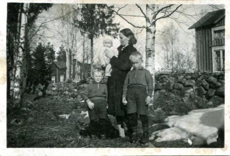 Anni Näs,f Boij 1915, med sina barn Christina 1943, Nils Erik 1938 och Karl-Johan 1937. Anni gift med Anselm Näs f 1909.
