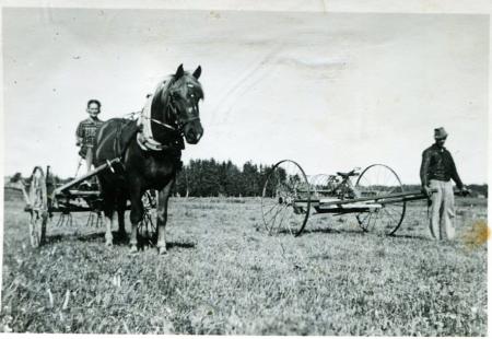 | Erik Rodas stående med "hästräfsan" och svägerskan Anna-Lisa sittande på "höjsprättin". Höbärgning pågår. | |