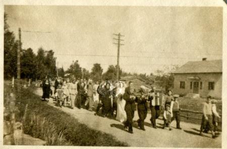 | Fotografi av brudpar efter vigsel i Tölby folkskola, den 24 april 1932. På fotografiet är brudparet längst fram i tåga med orkestern Casimé och nära släkt. | 24.4.1932 |