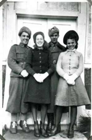 | De båda soldatklädda männen, Erling Rodas född 1920 och Erik Rodas till höger. De båda damerna okända | |