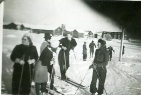 | Vid sparken Eric V Smeds, sittande Birger Påfs med Solveig Strand i Famnen, skidlöparen Eugen Forth. Solveig äldsta dotter till Karl-Gustav och Berit Strand. Berit född och uppvuxen vid "Paxal". | |