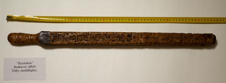 Budkavlen, "byastakan", är fyrkantig och 68 cm lång 3,8 cm bred. Kavlen har använts vid kallese till byastämma, som kallades "Bya-råd" varvid kavlen på Tölbymål kallades "byrådstakan".