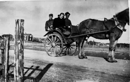 Längst bak i kärran sitter Erik Herrgård från Solf. Margit gifte sej med fabrikören Bengt Berg och flyttade till Vasa