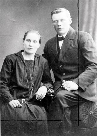 Fotografi som är taget på en fotoateljé av Algot Påfs (Simos Emelas Algot) och hustrun Ester (född) Enegren.