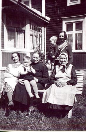 Sittande från vänster Ida Backman, Ulrika Nygård född Sten gift med Anders Johan Nygård hållande sitt barnbarn Jörgen Granholm född år 1939 i famnen, och Anna Sofia Backman född år 1864 i Runsor. Stående Saida Backman gift Yli-Poti med sonen Reino.