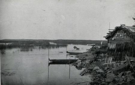 Foto taget i början av 1930-talet med de flatbottnade ekstockarna så kallade "öjtjor" med fören mot land och "painon" säkert nedtryckt i leran genom en ögla av rep i aktern av ekan.