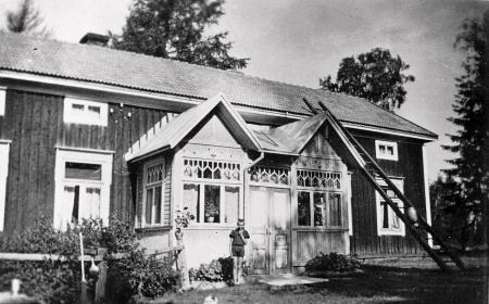 Sonen Rolf f. 1930 står förlägen vid trappen med fingret i munnen. Svarfvar hemmanets öden under mer än 200 år har dokumenterats av Bertel Thölix.