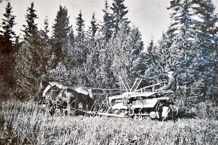 Självbindare blev vanliga i Tölby på 1950-talet. De drogs alltid av två hästar. Självbindaren underlättade skördearbetet väsentligt, det tunga arbetet att skära för hand upphörde och de i hopbundna kärvarna kunde endera läggas i skylar eller sättas på störar för torkning. --- Rågskylan bestod av 12-13 band, Korn pjockan 8-9 band, haverröckan 8-9 band och fröjpjockar (timotej) bestod av 8 band..