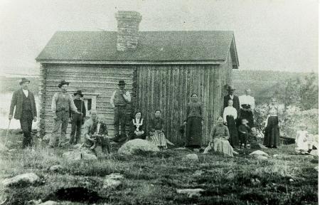 Fotografi av en skara människor vid en stuga vid vattnet i Bolot i Tölby.
