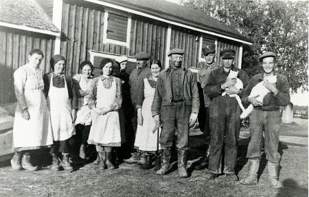 "Tröskanfolk" samlade på Handlaris gårdsplan. Fotot taget efter avslutad måltid.