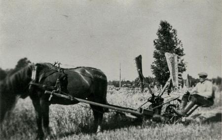 Algot Påfs skördar korn i hemåkern med enhästars Mc Cormick självavläggare med 3 1/2 fot skärbett. Tvåhästars skördemaskin fanns med 5 fots bett. Dessa skördemaskiner var i bruk under 1930-talet samt efter krigen 1939-1944.