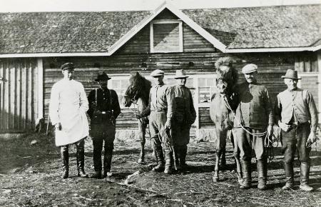 Från vänster: Veterinär Holger Lydman. Johannes Storslätt. Uno Thölix med hingstfölet "Jeck". Johannes U:son Påfs. Alfred Martin med hingstfölet "Tor". Abraham Anders Thölix, född 1856 och död år 1933.