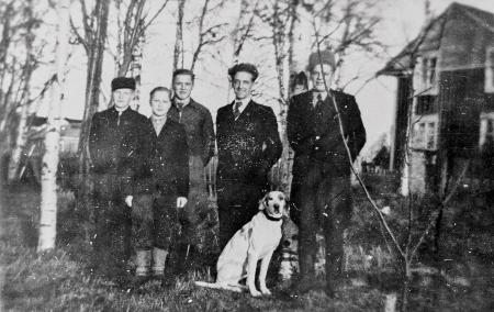 På bilden tre evakuerade karelska pojkar till vänster i bild, namnen är okända. Utöver de tre är även Bengt Österholm och Birger Påfs på fotografiet.