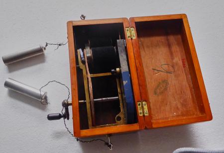 Sofia led av svår värk och använde apparaten för att lindra smärtan. Apparaten alstrar ström genom att en magnet roteras med en vev som finns på lådans utsida.