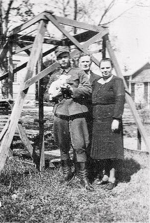 Fotografi av familjen Widell, där sonen Gösta är iklädd militäruniform och håller ett lamm i famnen. Dottern Greta saknas på fotot.