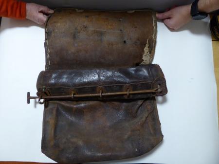 En ten av järn träddes in genom metallöglorna och med ett hänglås förseglades väskans innehåll.