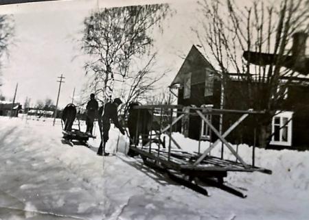 En vacker vinterdag när Birger Boij och Birger Påfs spänt för hästarna vid "Tåmosas" . Birger står vid höskrindan. Gården till höger i bild är Tåmosas mangårdsbyggnad, hitflyttad från Jurva 1900.