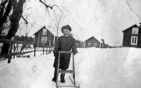 Bror f 1936 med sin sparkstötting vid Majbatas. Inget av de gamla husen i bakgrunden står kvar.