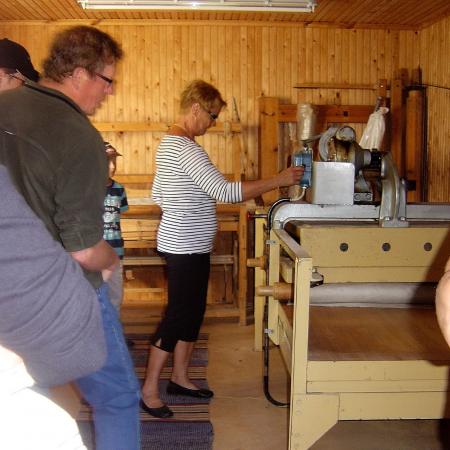 Margaretha Westergård demonstrerar Mangeln funktion för Folke Smeds och andra intresserade.