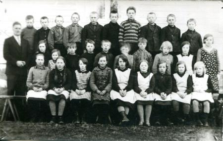 Lärare Erik Widell. Översta raden, okänd, John Thölix, Otto Martin, Bengt Österholm, Albert Granholm, Erik Österberg, Harry Thölix, John Skoglund, Birger Gästgivars, Arvid Skoglund. Rad 2, Elsa Hagman, Alice Johansson, Erik Rodas, Erling Rodas, Arne Laaksoharju, Sigurd Boij, Herbert Thölix, Anni Skoglund, Etel Uppgård, Etel Granholm. Rad 3; Lisa Hagman, Elin Holm, Agnes Boij, Berith Smeds, Viola Stenman, Annie Enholm, Adele Holm, Rut Forth, Margit Påfs.
